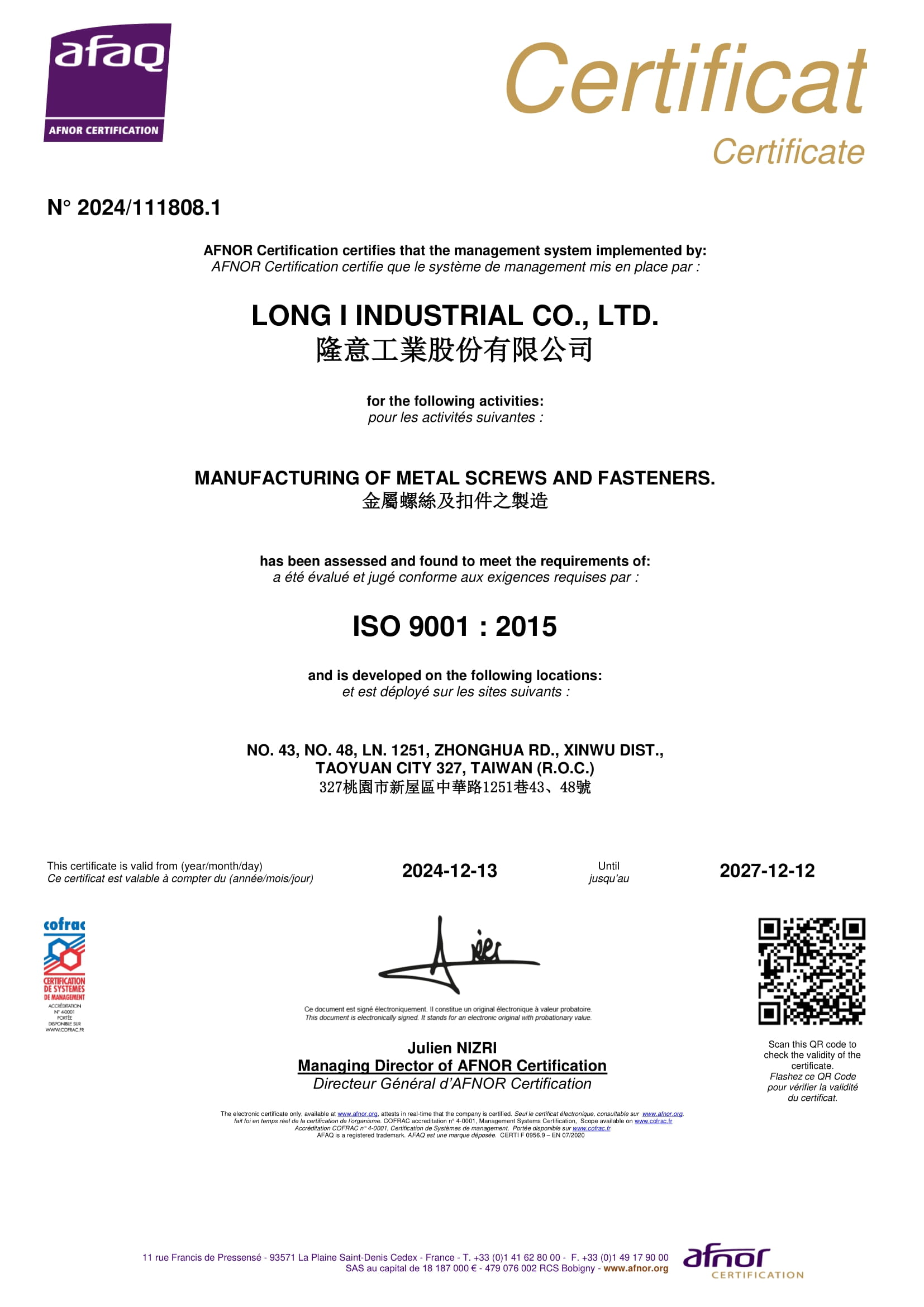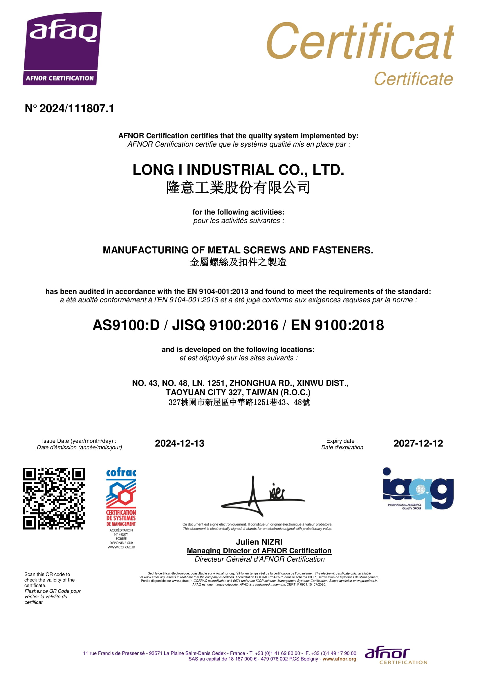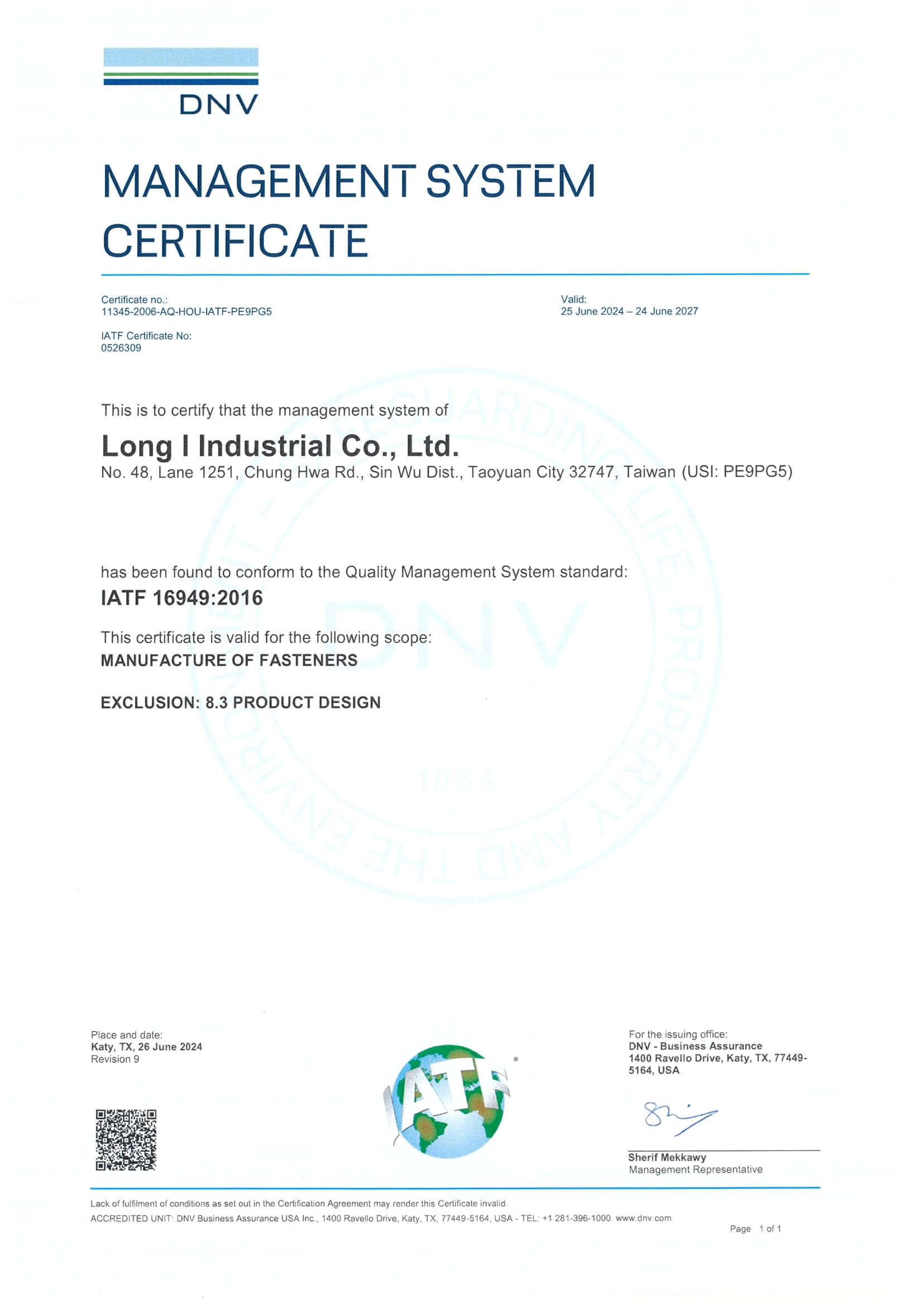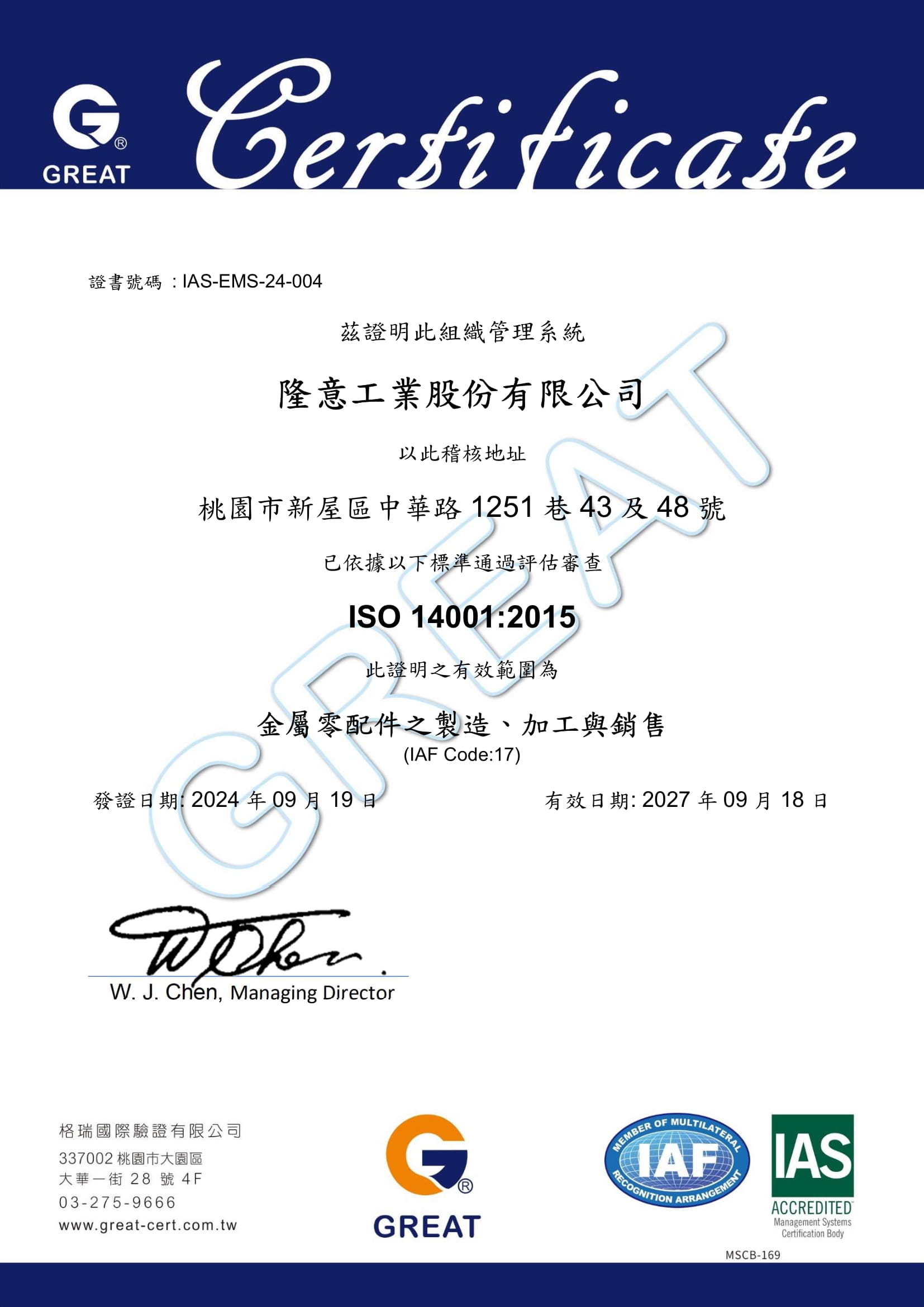 得獎與認證 2024 ISO14064 查詢聲明書、AS9100、ISO9001 2018 IATF-16949 證照(台灣隆意&無錫隆意) 2017 ISO14001 2013 榮獲裕隆企業優良廠商 2007 D-U-N-S Code65-770-1087 2006 ISO/TS16949 1999 QS 9000 1998 ISO-9002